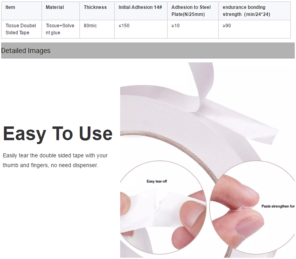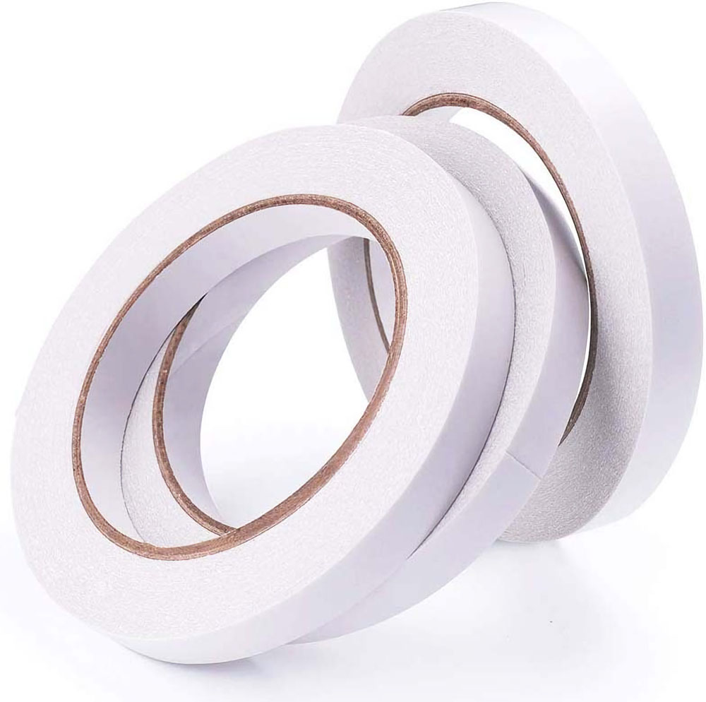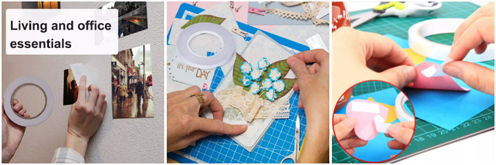 Double Sided Tape is made of Tissue Backing with Solvent glue, its has super sticky, can fix cards, card, paper, goods firmly. its usually for card marking, scrapbooking, mounting photoes, gift wrapping, photography, arts and crafts, very practical and convenient for daily life.