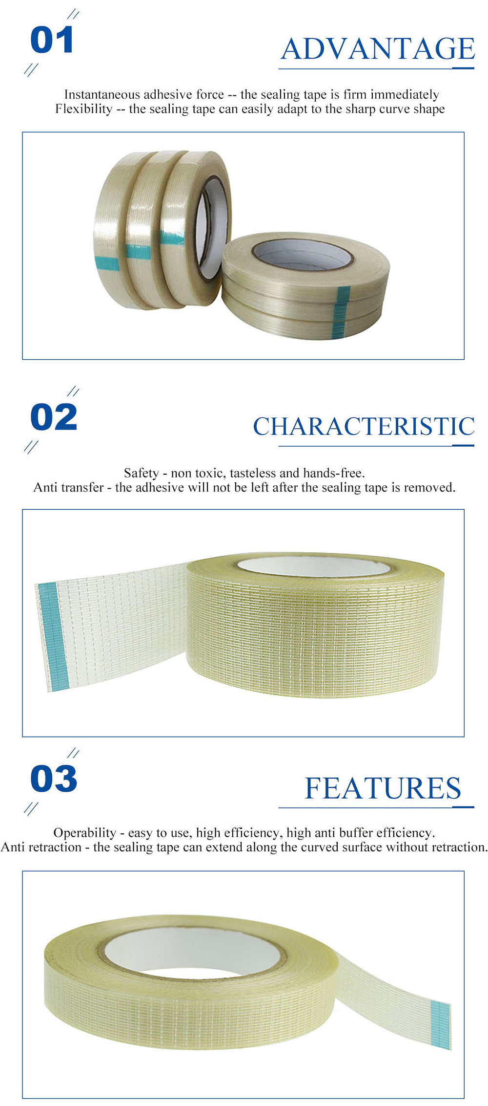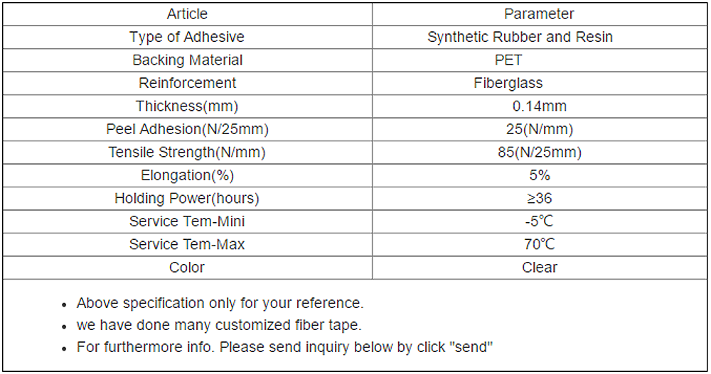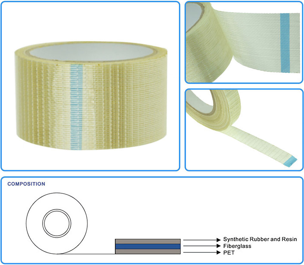 Fiberglass tape is made of three different layers that give the tape its distinct properties. The top layer is PET film that protect the tape.The middle layer is fiberglass with high temperature resistant.The bottom layer is synthetic rubber and resin.