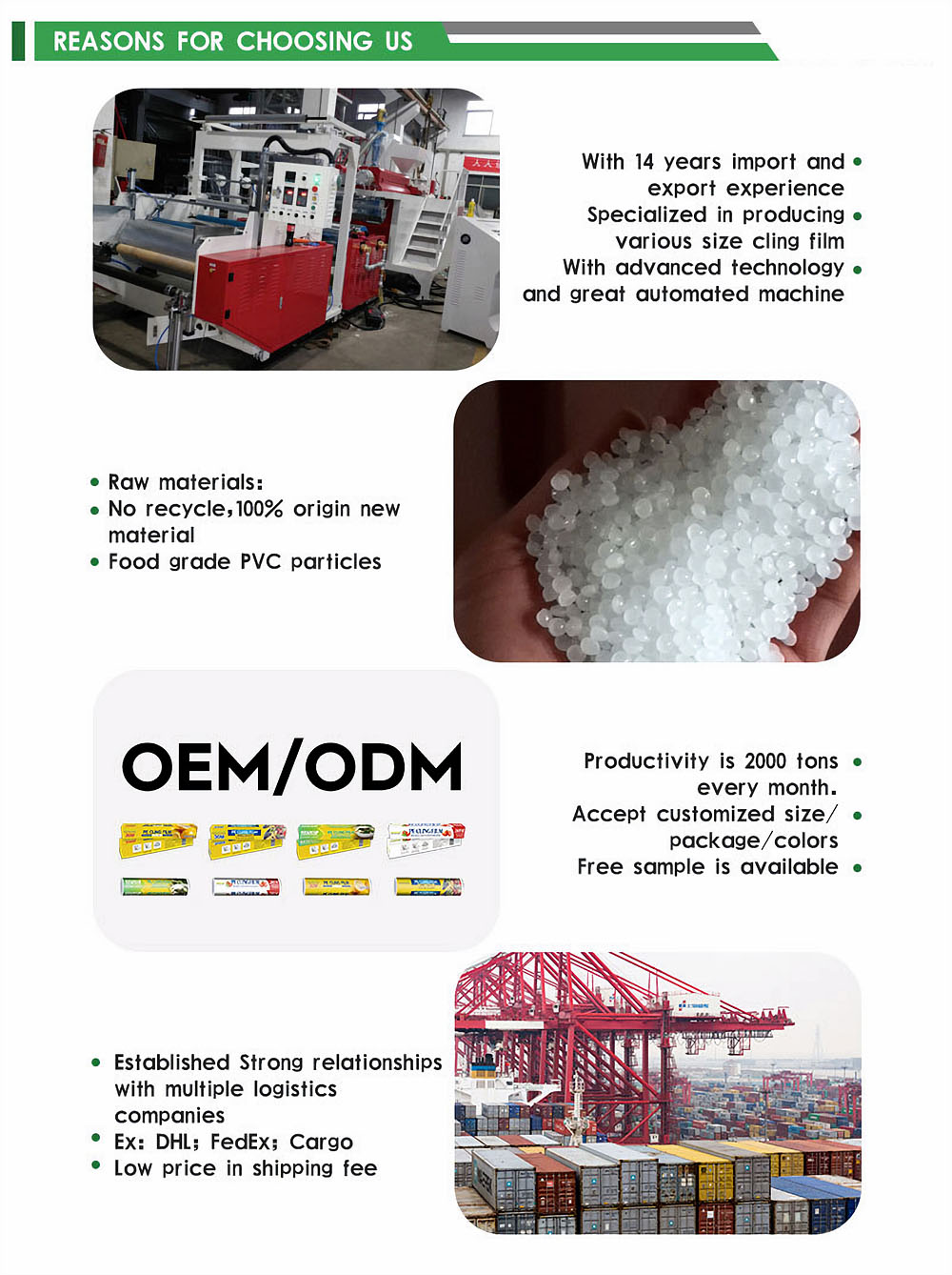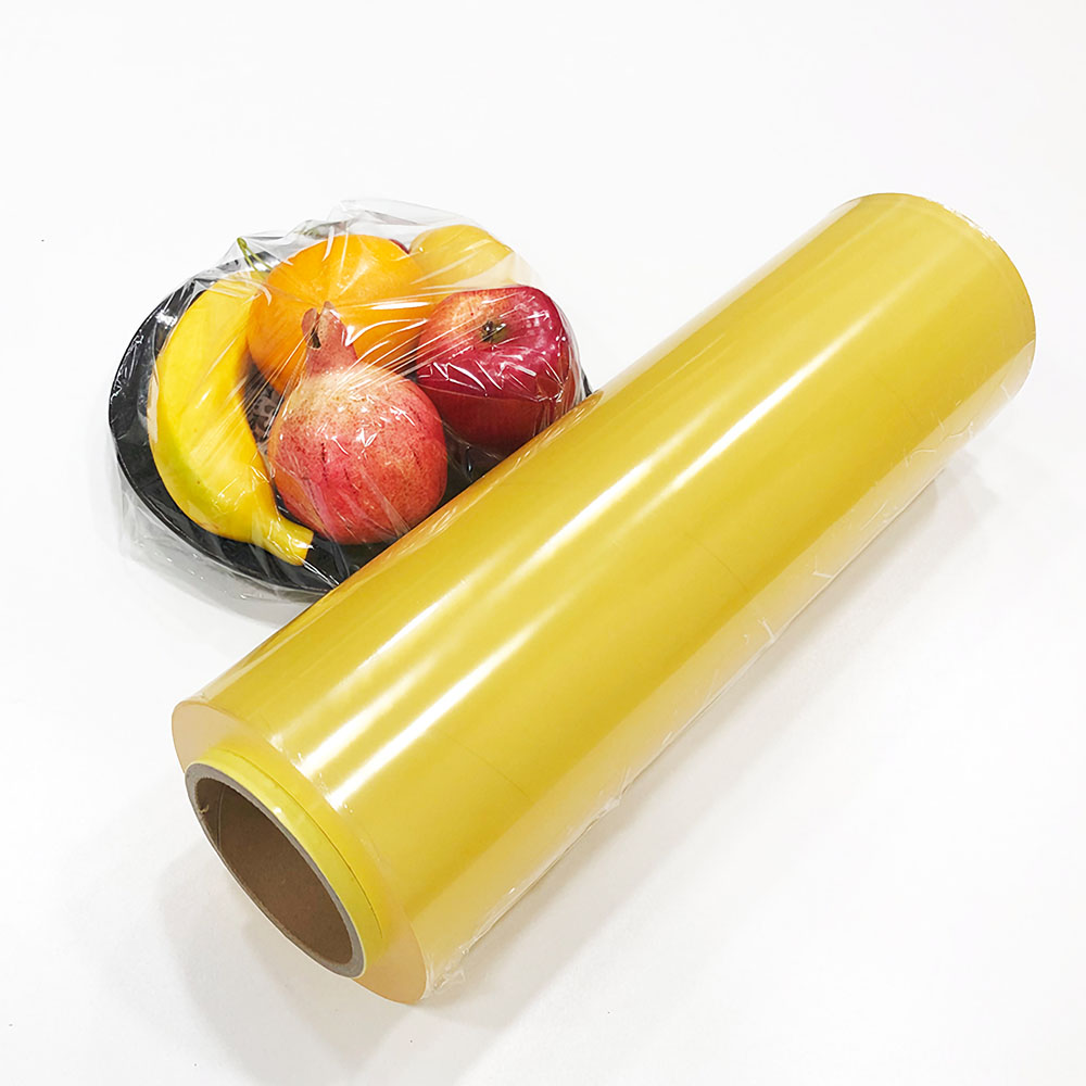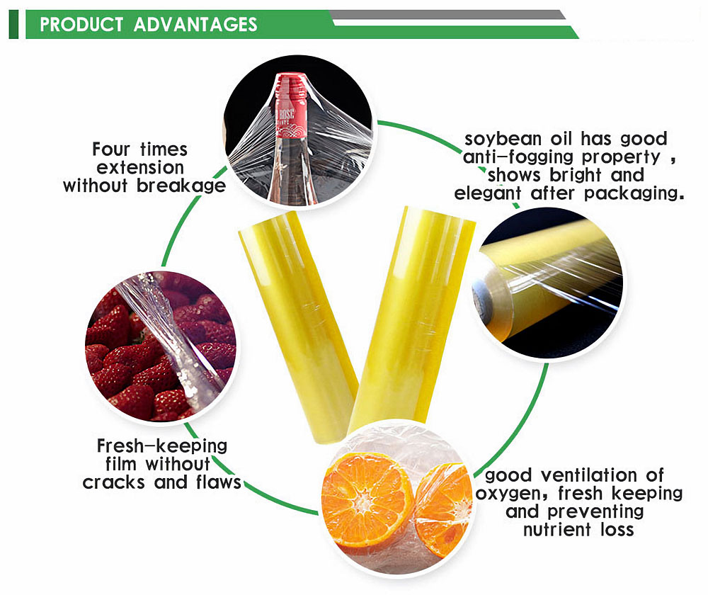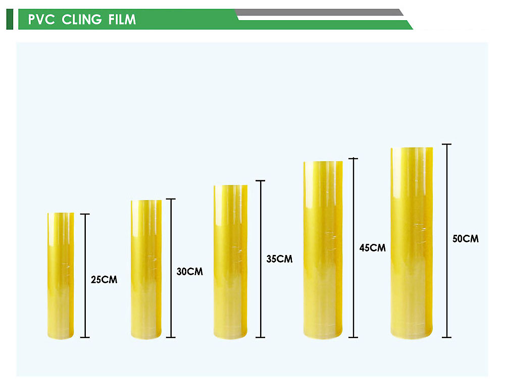 Green and Environmental Protection PVC Cling Flim due to its adequate softness, stickiness and elongation, can be well stretched over the food tightly without the trouble of sticking up and bad wrapping. suitable for both hand and machine wrapping.