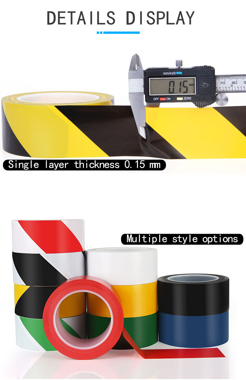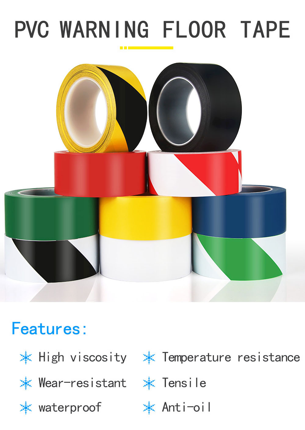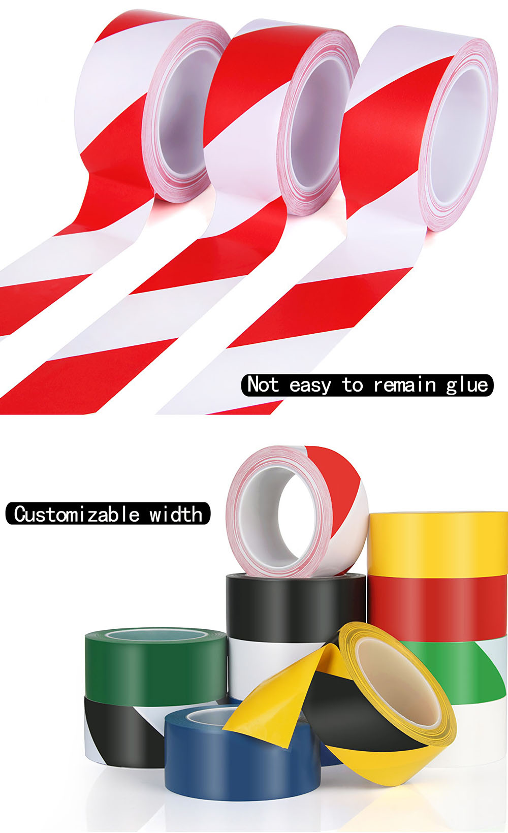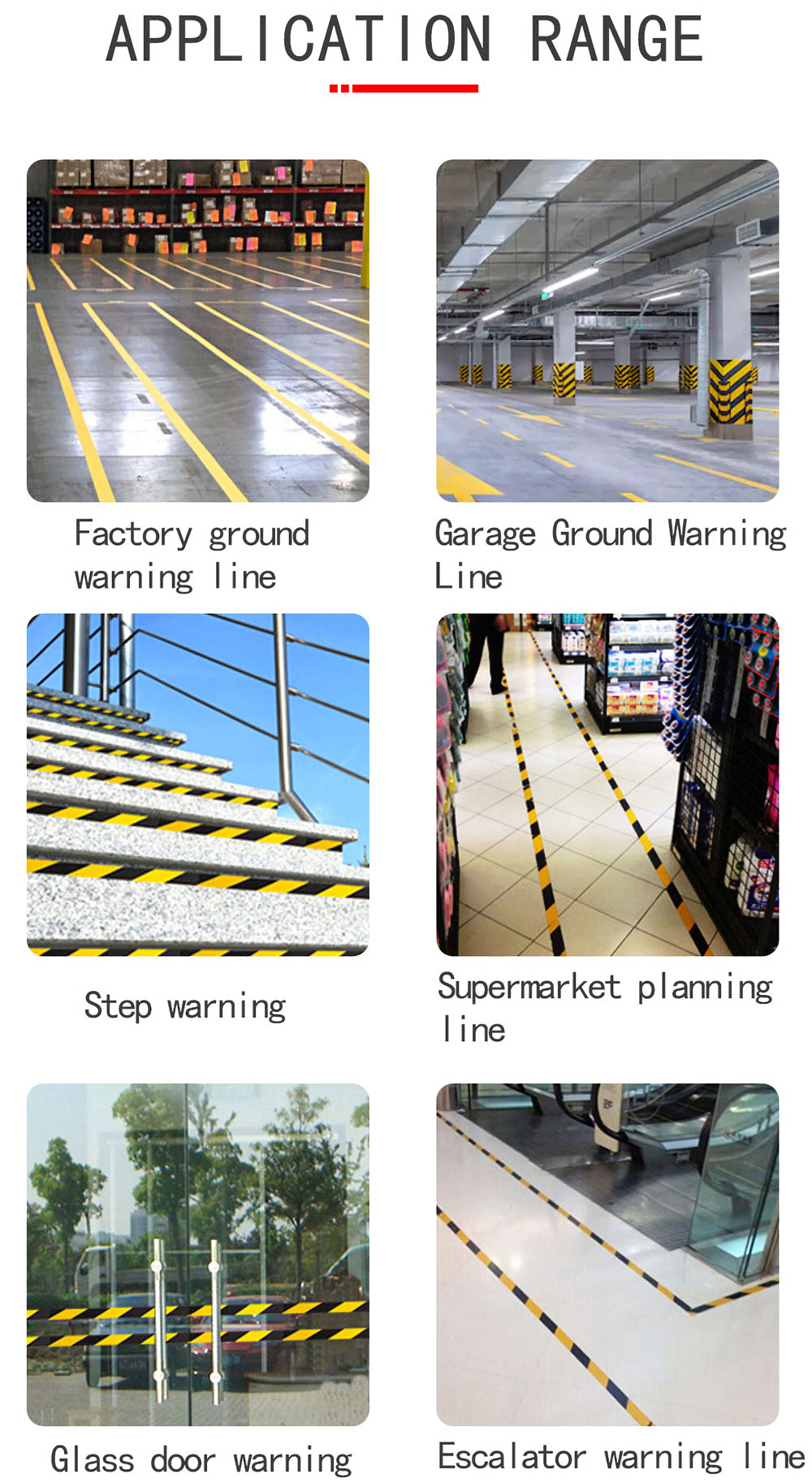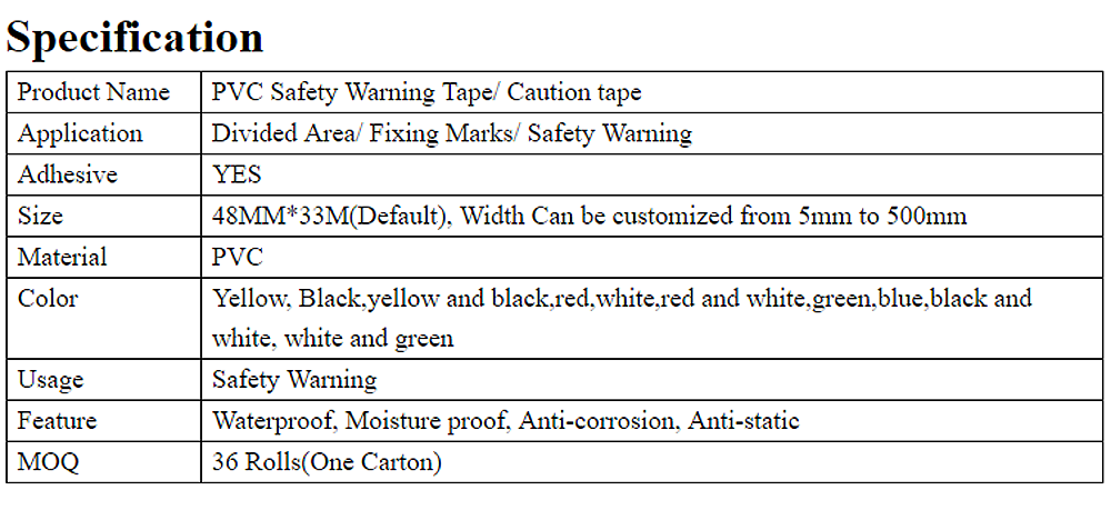 Scope of application: factory area division, parking lot parking division, basketball court marking, badminton court marking, painting use, air duct, oil pipeline, underground pipeline, ground, column, construction, warning signs, packing box sealing and other warnings.